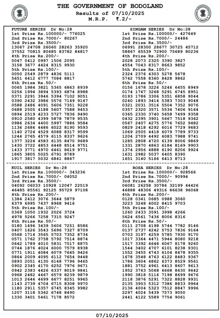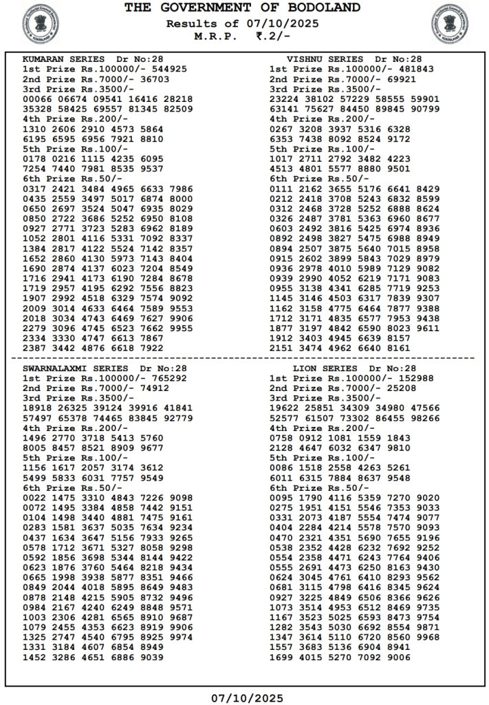 Check the Bodoland Lottery Result of 12:00 PM, 03:00 PM, and 07:00 PM. The official result will be released in PDF format every day. A large number of participants wait to check the official result. So, the participants can get the Results of Future Series, Singam Series, Kuil Series, Dear Series, Thangam Series, Swarnalaxmi Series, and Vishnu Series. Thus, we would like to upload the Bodoland Lottery Result every day for the participants.
